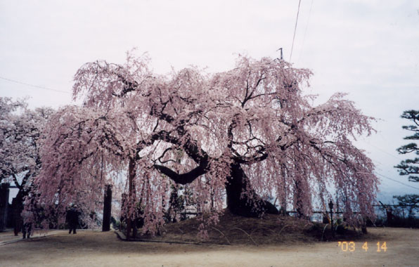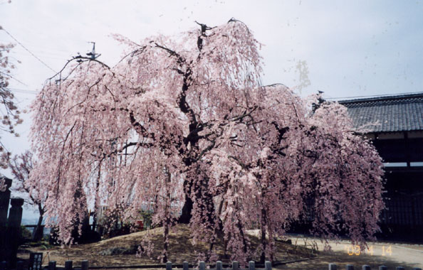 」で里人は「学校の枝垂櫻 」と呼んでいた。周りに障害物が無く、どこから見ても美しい姿が見られる抜群の環境だ。明治28年(日清戦争直後)体操場建築のため、現在地に移植された。言い伝えられている樹齢からすると、脇坂侯の弥陀四十八願の櫻の1本とも思われる。(正永寺の枝垂櫻