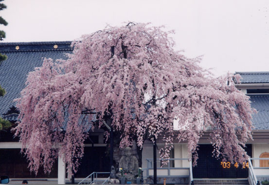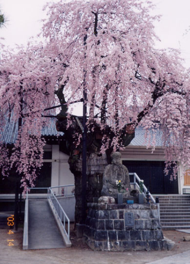 がある。樹高は10mと高くはないが天蓋を思わせるような形で、満開の花の下にはお釈迦様の石像。まことに微笑ましい風景である。この櫻は慶長9年(1604年)時の城主、小笠原秀政の帰依により、伊那から現在地に移転され、その時に植栽されたとも言われるが、脇坂侯の弥陀四十八願の一本である。(正永寺の枝垂櫻