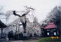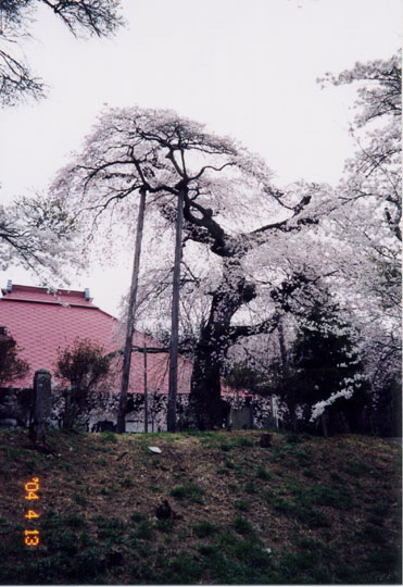 がある。三春の滝櫻に次ぐ県内第一級の巨櫻である。枝幹の一部が欠損しているのが残念。昭和51年県指定天然記念物。境内に通じる昔の参道には櫻が満開だったが、今では道幅が狭く車が入らないので、人が通らず寂しそう。境内の一隅にスタンプが置いてあった。町主催の「さくら紀行スタンプラリー」が行われているらしい。箱の中にはカラー版の素敵な案内パンフがあったので頂戴する。これから廻りたい4名木、1名所があるではないか。運転手さんも土地不案内だったので大いに助かる。 |