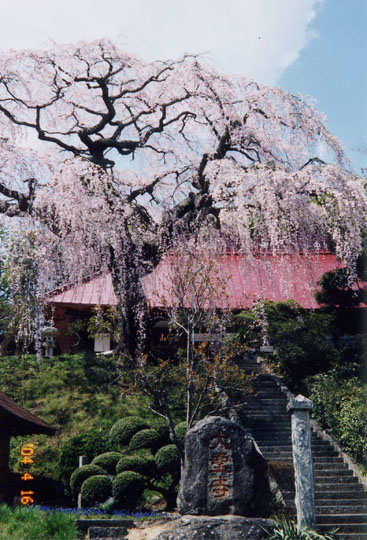 JR要田駅すぐ近くに大聖寺がある。石段を上がった本堂左手に「大聖寺の紅枝垂櫻 」がある。樹齢340年の古櫻で樹冠も大きいが、花付きが一寸少ないか。静寂な寺に良く似合う。