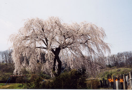 町の中央部、船引地区にある民家の墓地に若い枝垂櫻 があった。密集した細い枝にはびっしり花が付いていた。