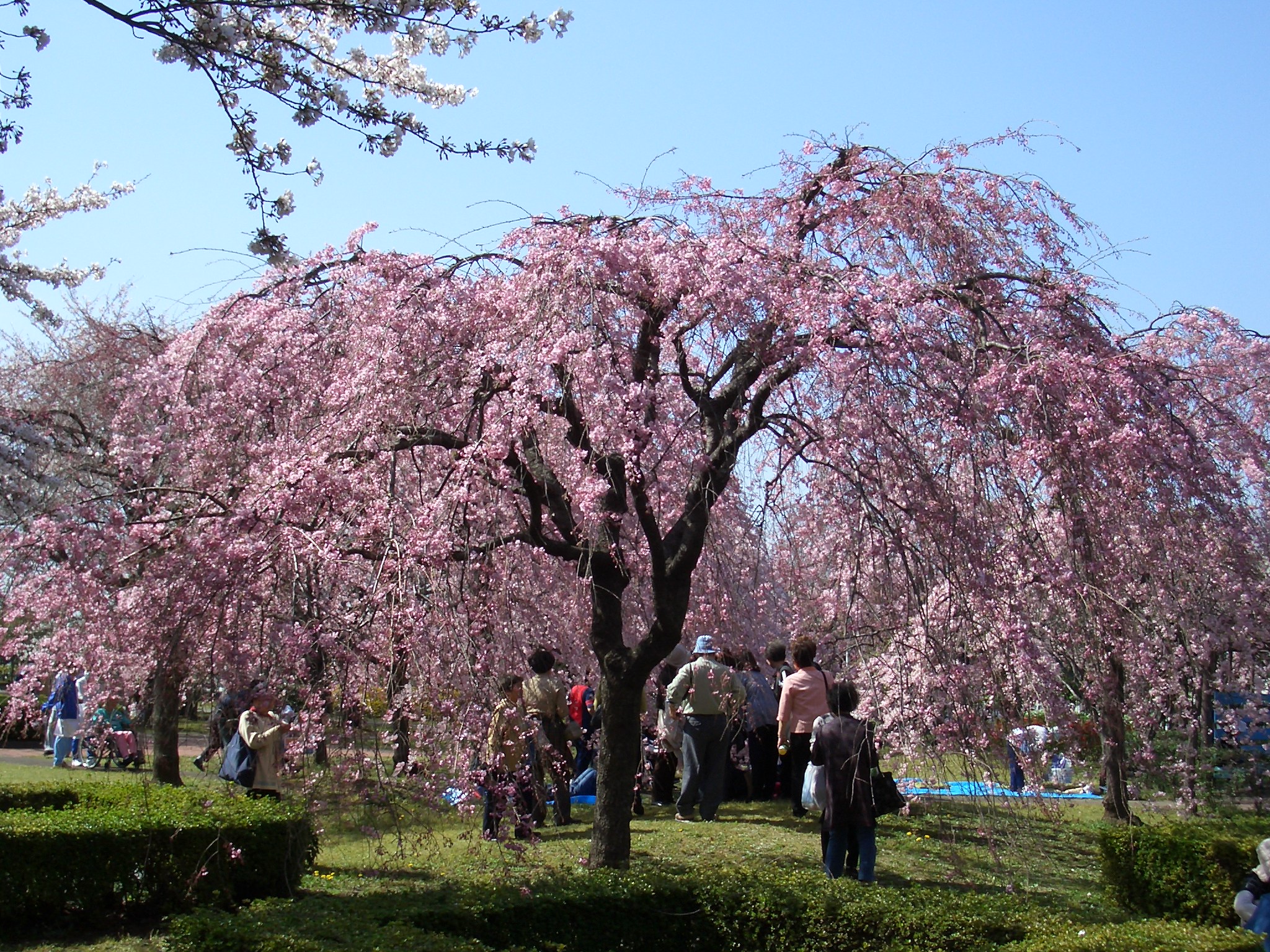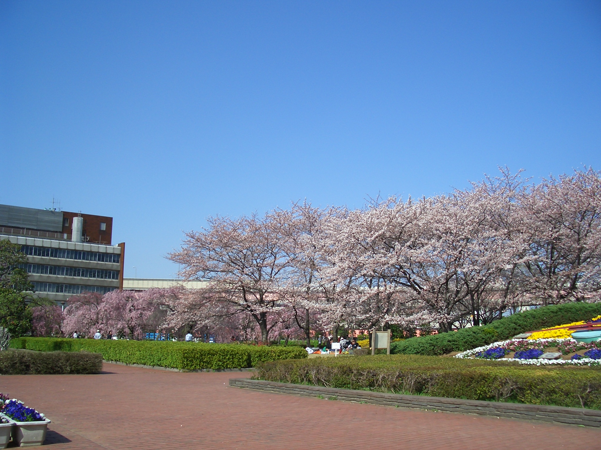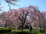 堀切菖蒲園駅より平和橋通りを北西に15分ほど行くと小菅西公園に着く。高速道路小菅インターの脇にある小菅水再生センターの屋上庭園である。何段もの傾斜通路を登りきった園内は正に櫻の屋上天国。北東部の一画には濃いピンク色のヤエベニシダレザクラ