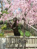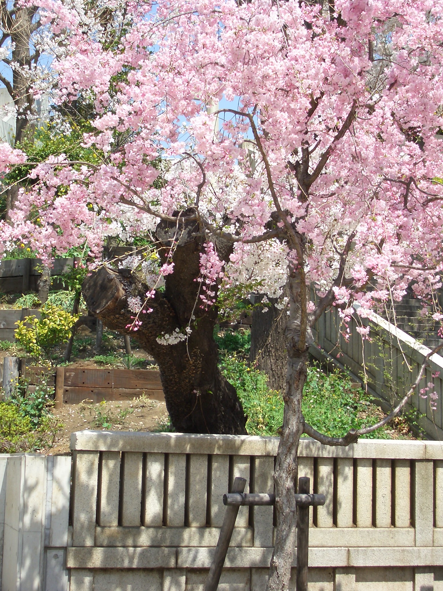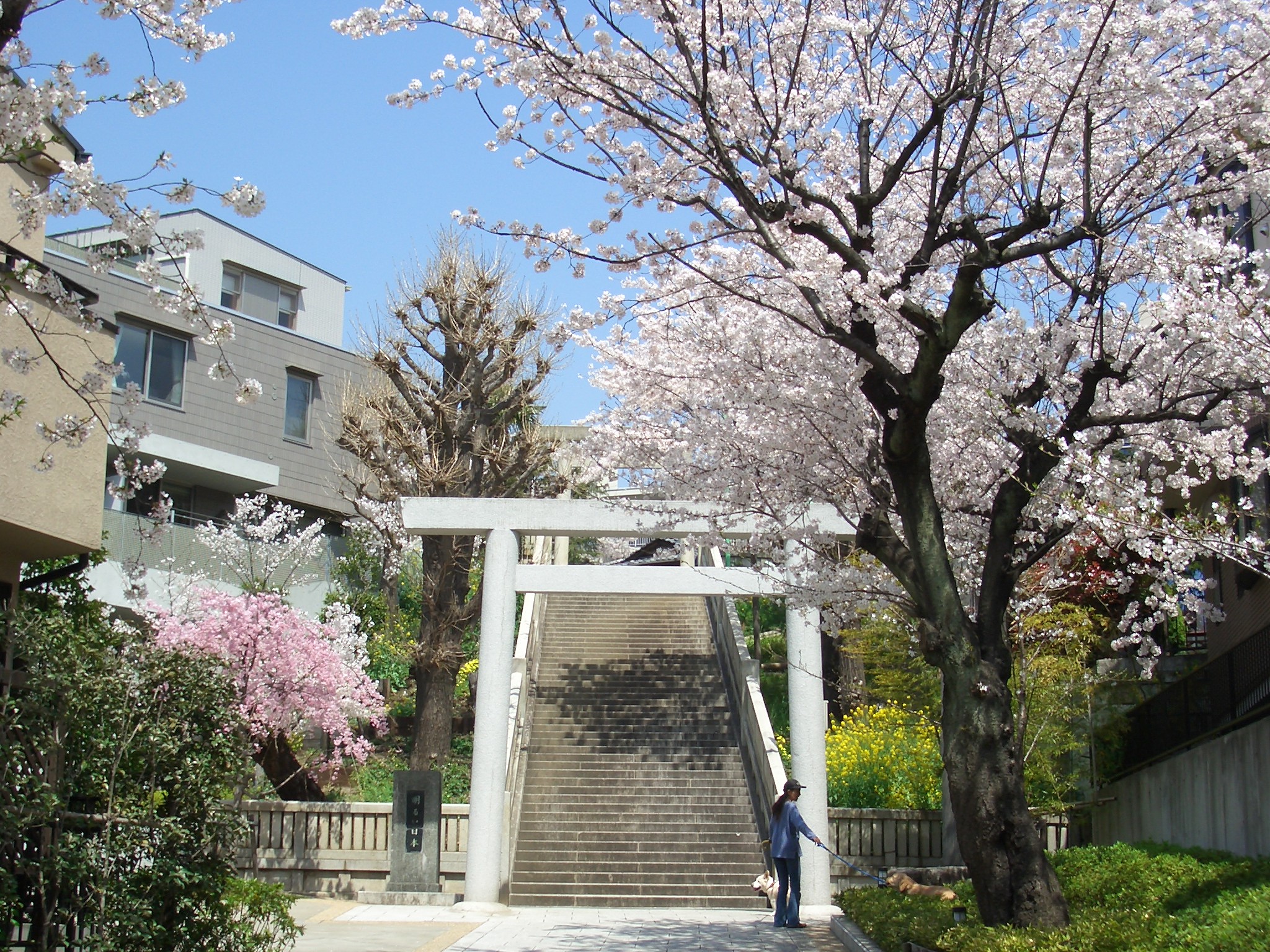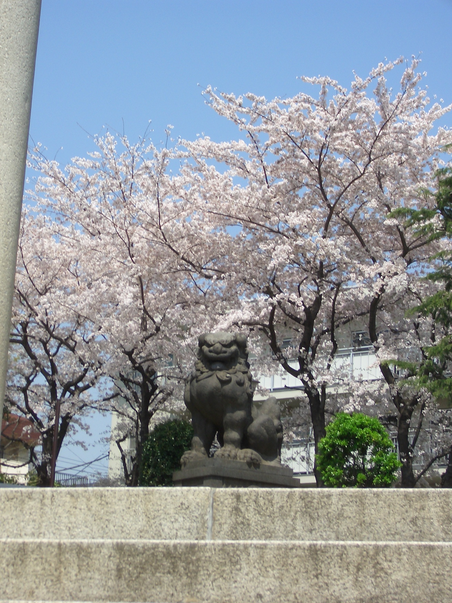 小石川植物園の北西部に接している。最近社地を整理、改装したようだが八幡太郎義家が戦勝を祈願して参籠したという伝承のある古社である。鳥居脇に櫻の古木とシダレザクラの若木が並び、境内にある数本の櫻と共に満開状態で迎えてくれた。石の階段を登って行くと正面に櫻をバックにした狛犬が現れびっくりする。隣地にある小石川植物園の裏口(入園は出来ない)からは、旧東京医学校の建物や、お花見の様子が垣間見えた。