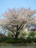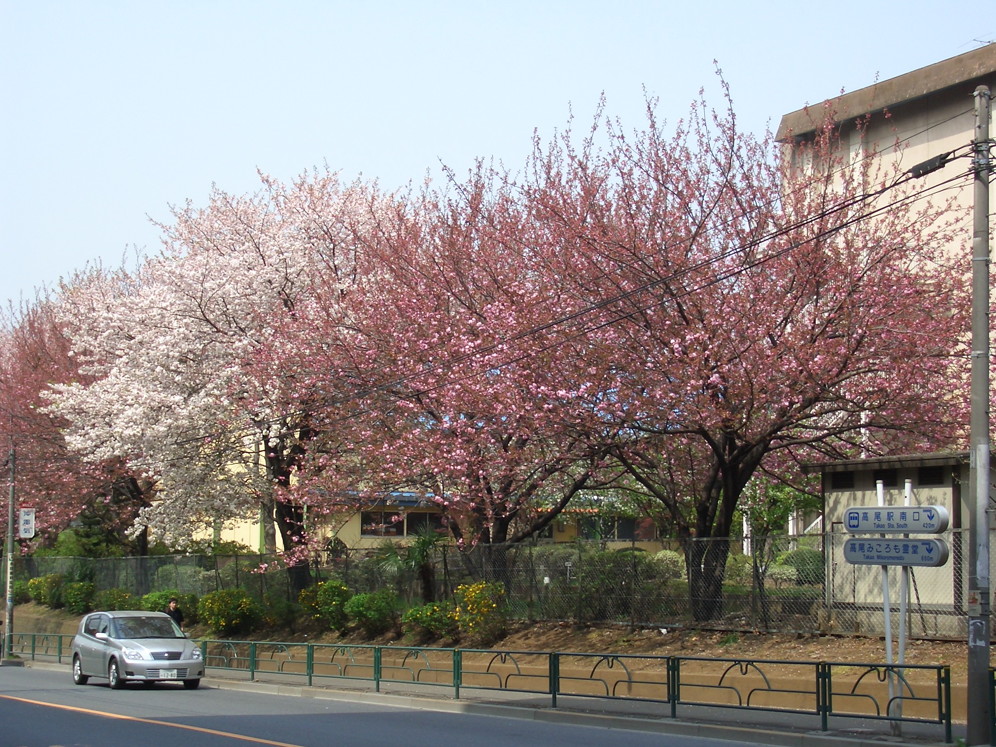 朝来るとき、高尾駅の手前で電車の中からちらっと見えたヤエザクラが気になり、陵南公園の帰りに立ち寄る。甲州街道を左折町田街道に入り、中央線の踏切を越えた所が東浅川小学校だ。道路沿いに大きなヤエザクラの並木があり、紅白入り乱れて咲き競っていた。