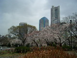 伊勢山皇大神宮から一旦町中まで下り、県立音楽堂横の入口から入園。坂道を登りきると急に視界が開け「みなとみらい21」のランドマークタワーの姿が目に飛び込んできた。広場周辺の古櫻は満開寸前の勢いに満ちていた。一画に小振りな枝垂櫻 があったが色づき始めた所だ。正面奥に公園名の由来となった幕末の開港論者、大老・井伊掃部頭直弼の銅像が海を望んで立っていた。