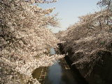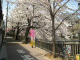 板橋区役所前から仲宿商店街に入ると旧中仙道・板橋宿である。煉瓦の袖壁が付いた出桁造りの「板五米店」など古い商家が2,3見られた。15分程で「板橋」に着く。此所から石神井川について上ると、だんだん櫻の樹も増え、川面に届くばかりの豊かな枝振りの並木が続く。東上線のガードを潜った辺りで櫻並木も途切れたので戻る。このガード下の壁は真っ白に塗られ、子犬を連れた少女の影絵や、綺麗な色の着物柄などの額絵が描かれていて素敵な空間だった。