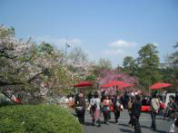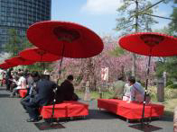 国立劇場の前庭には駿河櫻、小松乙女,神代曙、八重紅枝垂、仙台屋、寒山の各種類が多少の時期の差で、咲き誇り、来場者の眼を楽しめさせるという。